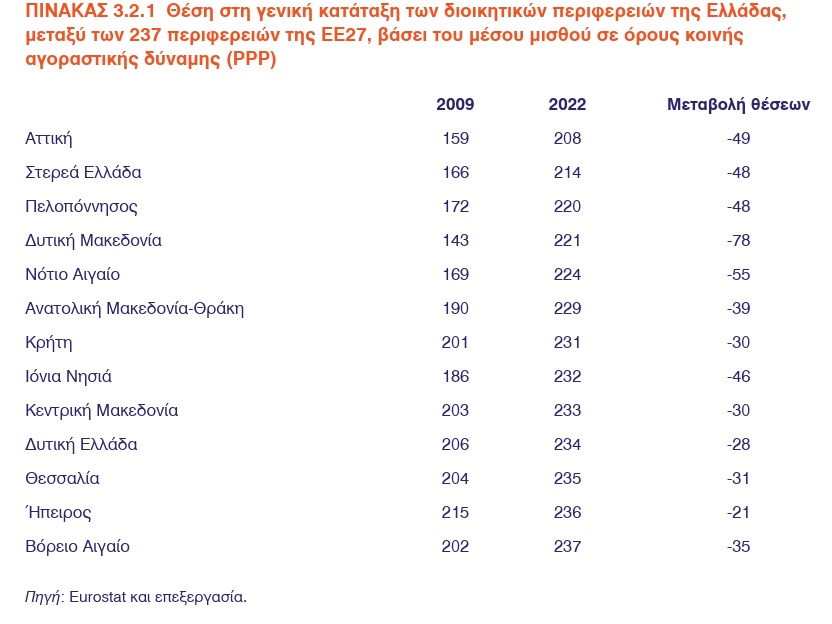 Οι ελληνικές περιφέρειες «έπεσαν» περίπου 40 θέσεις στην ευρωπαϊκή κατάταξη μεταξύ 2009 και 2022, καθώς ενώ άλλες περιφέρειες (και χώρες) ανέβαιναν θέσεις, η Ελλάδα είτε έμεινε στάσιμη, είτε υποχώρησε- με αποτέλεσμα να «μας προσπεράσουν» ακόμη και πολλές ανατολικοευρωπαϊκές περιφέρειες. Αλλά και στο εσωτερικό της χώρας, οι τοπικές ανισότητες ενισχύθηκαν, καθώς εκτιμάται πως οι περιφέρειες με χαμηλή παραγωγικότητα, λίγες επενδύσεις και απομακρυσμένες περιοχές πλήττονται περισσότερο.