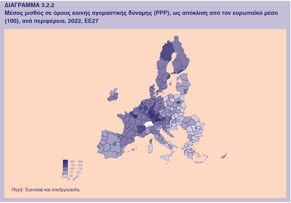 Μεταξύ των 237 περιφερειών του δείγματος των χωρών της ΕΕ των 27, οι ελληνικές περιφέρειες καταλήγουν να καταλαμβάνουν τις τελευταίες θέσεις στον μέσο μισθό. Το 2009, η περιφέρεια Βορείου Αιγαίου κατατασσόταν στην 202η θέση, ενώ το 2022, εμφανίζεται στην 237η (τελευταία). Αντίστοιχα, η περιφέρεια Ηπείρου εμφανίζεται στην προτελευταία θέση (236η). Κατά μέσο όρο, μεταξύ του 2009 και του 2022, οι περιφέρειες της επικράτειας έχουν υποβαθμιστεί κατά περίπου 40 θέσεις.